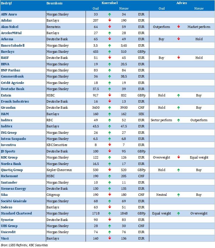 - Het koersdoel voor KBC Group gaat bij Morgan Stanley van 122 naar 126 EUR en de aanbeveling verandert van Overweight naar Equal weight