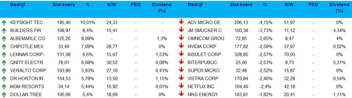 Keysight Technologies: {{115598164, KEYSIGHT TECHNOLOGIES INC., KEYS}} het Amerikaanse technologiebedrijf rapporteerde rapporteerde een winst van 1,92 dollar per aandeel voor het fiscale vierde kwartaal, tegenover een gemiddelde analistenverwachting van 1,83 dollar per aandeel. De omzet uit communicatie en industriële elektronica bedroeg respectievelijk 990 miljoen dollar en 429 miljoen dollar, boven de prognoses van analisten. Het bedrijf kondigde ook een nieuw aandeleninkoopprogramma aan ter waarde van maximaal 1,5 miljard dollar van zijn gewone aandelen.
