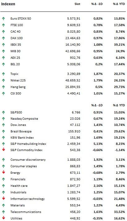 - De Europese kar werd gisteren getrokken door de bouw- en grondstoffensector en financiële aandelen. Zo klom het Duitse Heidelberg Materials 6,6%, cementmaker Buzzi 6,1% en steenwolproducent Rockwool 4,5%. Dat duwde de Duitse DAX de Franse CAC respectievelijk 1% en 0,8% hoger, terwijl de BEL20 met een veel kleinere winst toch de kaap van 5.0000 punten sloopte. De energiesector kreeg rake klappen, omdat de prijs voor een vat Brent-olie 2% daalde tot 61,77 dollar en de Europese gasprijs 1% terugviel tot 29.4 euro per MWh. Een mogelijk einde van het conflict kan de oliemarkt sterk beïnvloeden, omdat er mogelijk extra Russische productie naar de markt kan komen.