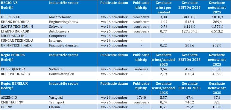 - Bedrijfsresultaten komen er vandaag van Ascencio, CD Projekt, CMB Tech, Deere & Company, Ehang Holdings, Gaotu Techedu, Li Auto, MicroAlgo, OCI, Rockwool, Suncar Technol, UP Fintech.