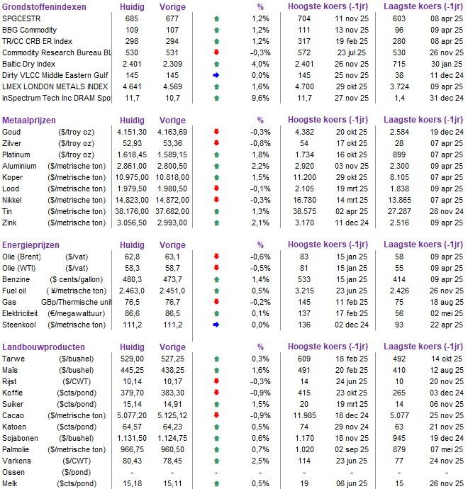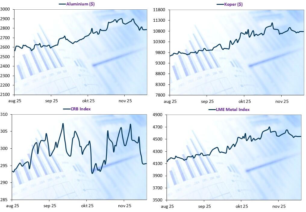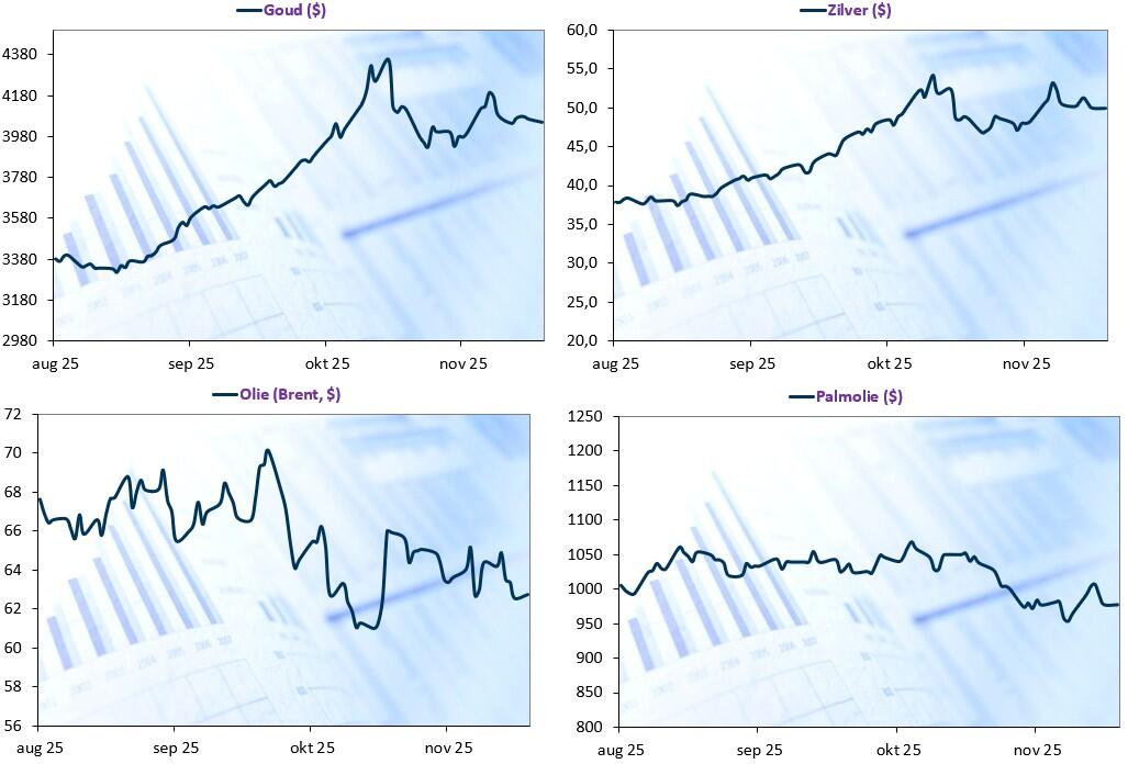 - Centraal stond nog altijd de hoop op een renteknip in december (de kans daarop steeg van 30% begin vorige week tot 85% vandaag), al bleek uit het wekelijkse rapport dat de arbeidsmarkt zeker niet implodeert. Het aantal Amerikanen dat een nieuwe werkloosheidsuitkering aanvroeg daalde tot het laagste niveau in zeven maanden, wat suggereert dat het aantal ontslagen laag bleef. Een tweede drijfveer was de ‘normalisatie’ van de verwachtingen in de technologiesector (is er dan toch geen “AI-bubbel”?). Op de brede markt herstelde de Bitcoin met 1% naar 90.944,55 dollar en lijkt zo op weg om een verliesreeks van vier weken te breken. Geen verliesreeks voor goud, dat weliswaar 0,4% daalde naar 4.146,53 dollar per ounce.