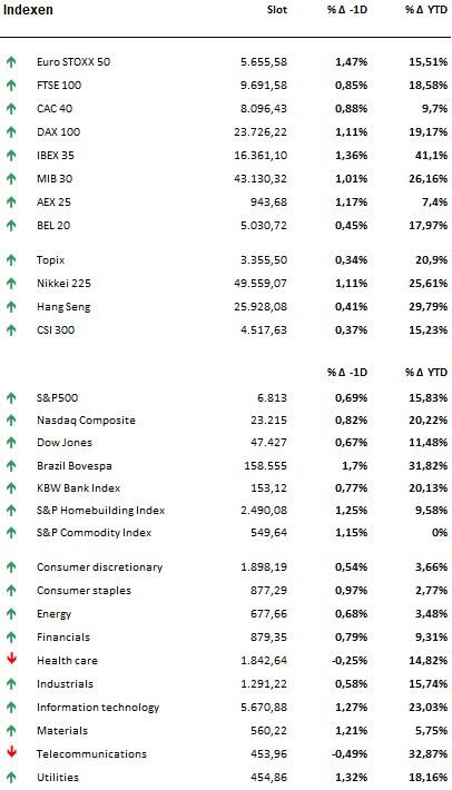 - De wereldwijde aandelenbeurzen verteerde de recente dip gisteren nog wat meer, zodat de Euro Stoxx 600 (+1,1%), de S&P500 (+0,7%) en de Nasdaq +0,8%) weer dichter in de buurt van hun eerdere records konden sluipen. Ook de Aziatische aandelen zetten vannacht hun beste beentje voor, wnat de MSCI Asia-Pacific koerste 0,4% hoger, een beweging ondersteund door de Japanse Nikkei (+0,4%), de Zuid-Koreaanse Kospi (+0,7%) en de indexen in China en Hongkong (+0,6%).