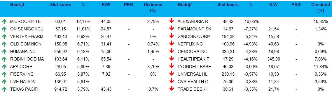 - Op bedrijfsniveau sprongen enkele namen eruit. Marvell Technology steeg 7,9% na de aankondiging van een overname van Celestial AI ter waarde van 3,25 miljard dollar. Microchip Technology won 12,2% dankzij verhoogde verwachtingen voor het derde kwartaal. American Eagle Outfitters schoot 15,1% omhoog na een opwaartse bijstelling van de omzetprognose voor het jaar.