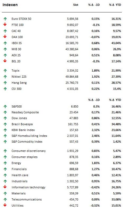 - Europese aandelen (+0,1%) sloten woensdag grotendeels vlak, al compenseerde winst voor technologieaandelen (+1,2%) de neerwaartse druk op de financiële sector. Het Spaanse modebedrijf Inditex was de ster van de dag (+9%) dankzij een sterke start van de winterverkopen en een dijk van een Black Friday-weekend. De hele retailsector steeg daarom met 3,5%, terwijl ook defensiebedrijven met 2,3% stegen en grondstoffen er 2,6% bijkregen.