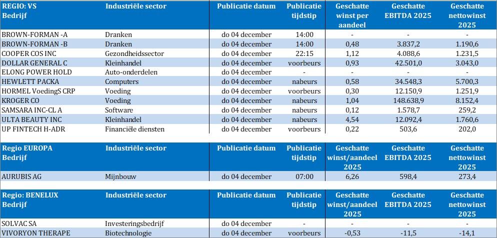 - Bedrijfsresultaten worden dan weer aangeleverd door onder meer Aurubis, Brown-Forman, Cooper Companies, Dollar General, Elong Power Holdings, Hewlett Packard, Hormel Foods, Kroger, Samsara, Solvac, Ulta Beauty, Up Fintech en Vivoryon Therapeutics.
