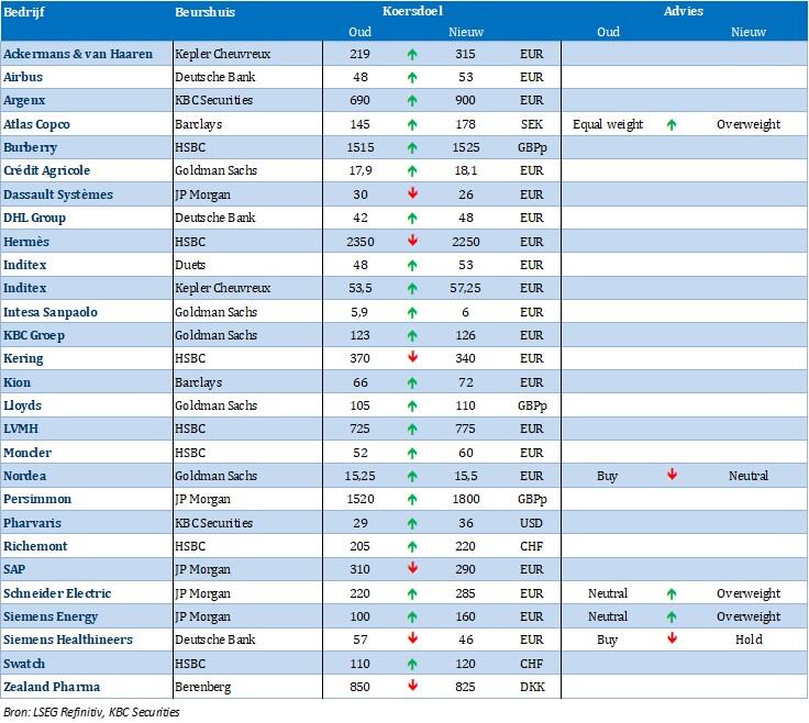 argenx: {{105333308, ARGENX SE, ARGX}} KBC Securities verhoogt het koersdoel naar 900 euro (van 690 euro) bij een “kopen”-aanbeveling dankzij een katalysatorrijk 2026 met vijf fase 3-resultaten voor Vyvgart en empasiprubart. Succesvolle studies kunnen de commerciële kansen aanzienlijk uitbreiden en argenx dichter bij zijn Vision 2030-doel brengen van 50.000 patiënten op behandeling. De aangepaste waardering, inclusief nieuwe indicaties en een lagere WACC, ondersteunt het hogere koersdoel.