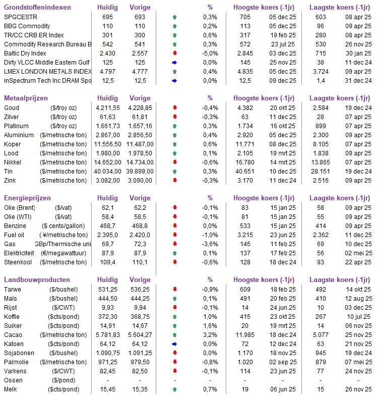 - Afsluiten doen we op de grondstoffenmarkten. De prijs voor ijzererts steeg gisteren tot boven 770 yuan per ton, na een herstel vanaf het laagste niveau in vijf maanden. Chinese staalproducenten verhogen hun voorraden in aanloop naar de feestdagen, ondanks de voortdurende maatregelen van Peking tegen overcapaciteit. Het sentiment kreeg extra steun door de nakende Amerikaanse renteverlaging, terwijl China’s jaarlijkse Central Economic Work Conference er ook aan zit te komen. En die houdt groeidoelstellingen en beleidsplannen in voor 2026.