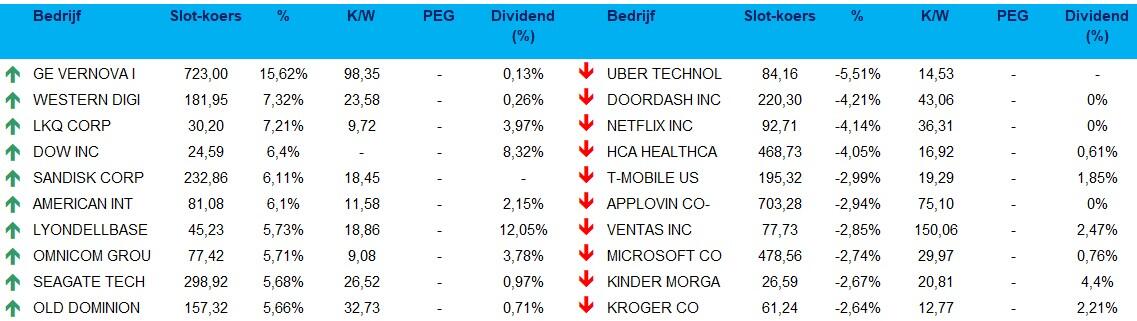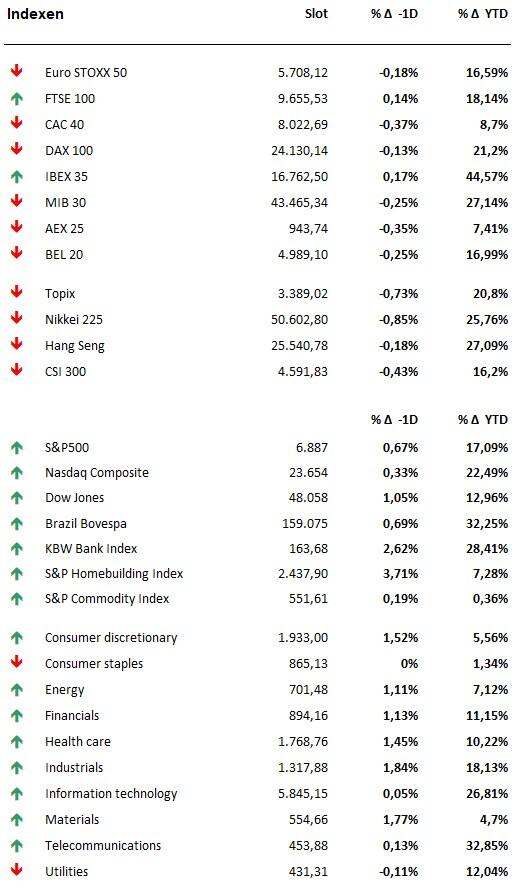 - Na de slotbel kwam tech- en cloudgigant Oracle echter met teleurstellende resultaten aandraven, wat 11% koersverlies opleverde. U raadt het al: druk op AI-winstgevendheid, wat de sfeer meteen verzuurde in zowat alle industriesectoren die Wall Street rijk is . AI-hoogtevrees woog nadien ook zwaar op de Aziatische markten, waar vooral ook de AI-gerelateerde aandelen klappen kregen. Tel daarbij de aanhoudende onzekerheid rond de hoogte van de Amerikaanse (en Europese) rentes en een pak lastige obligatieveilingen wereldwijd en de kerstrally lijkt plots geen zekerheid meer. Europa mag zich opmaken voor een lastige dag.