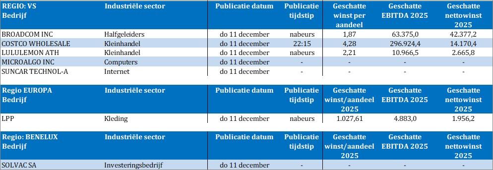 - Bedrijfsresultaten komen er verder van Broadcom, Costco Wholesale, LPP, Lululemon Athletica, MicroAlgo, Solvac en Suncar Technology. Leuk is dat