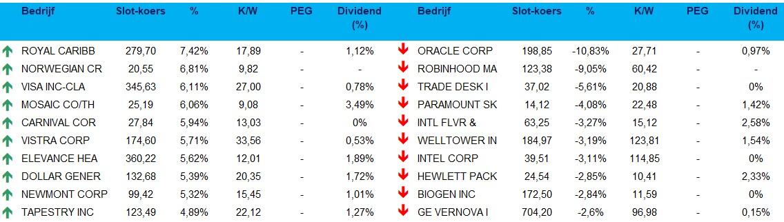 Costco {{72721, COSTCO WHOLESALE CORP., COST}}: de Amerikaanse groothandel zag in het eerste kwartaal de winst stijgen van 1,8 naar 2,0 miljard dollar, mede dankzij een belastingvoordeel van 72 miljoen dollar. De omzet groeide van 62,15 naar 67,31 miljard dollar, iets boven de gemiddelde analistenverwachting van 67,14 miljard dollar. De vergelijkbare omzet steeg met 6,4%, tegenover een verwachte 6,0%, terwijl de groei in de VS 5,9% bedroeg. Hogere productverkopen en lidmaatschapsinkomsten droegen bij, maar het aandeel bewoog nabeurs nauwelijks na een winst van 1,2% in de reguliere sessie.