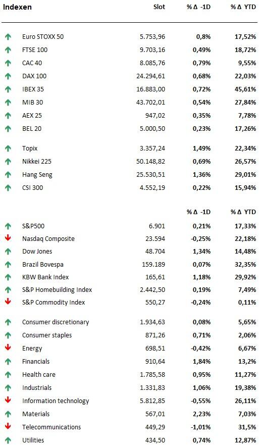 - De Aziatische beurzen tonen vandaag een overwegend positief beeld, met Japan (+1,88%) en Zuid-Korea (+1,38%) als duidelijke winnaars. Hongkong volgt met +1,55%, terwijl China (+0,63%), Taiwan (+0,62%) en India (+0,48%) ietwat meer “bescheiden” stijgingen laten zien. Ook Zuidoost-Azië noteert licht groen: Maleisië (+0,68%), Indonesië (+0,50%) en de Filipijnen (+0,78%).