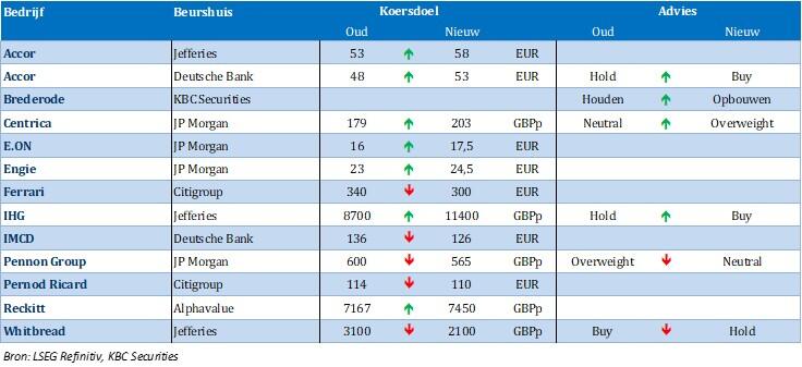 - Het koersdoel voor Accor gaat bij Deutsche Bank van 48 naar 53 EUR en de aanbeveling verandert van Hold naar Buy