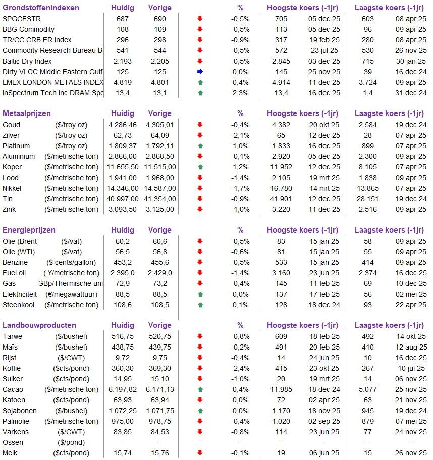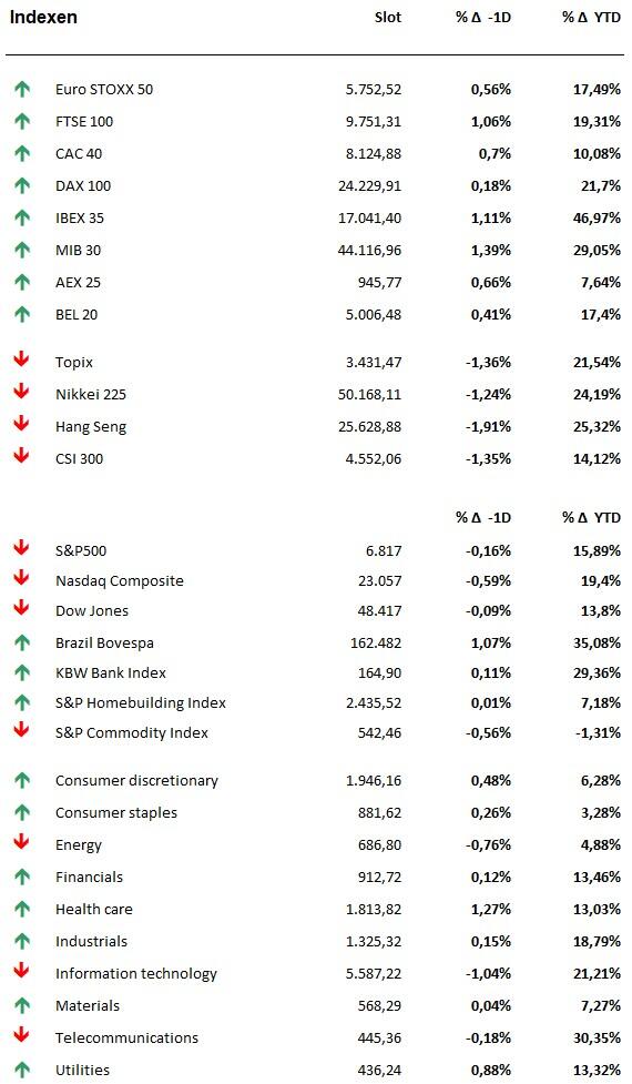 - Anders dan in de VS en Europa klokten de Aziatische beurzen duidelijk lager af. De grootste dalingen kwamen uit Hongkong (-2,03%), Zuid-Korea (-1,86%), Japan (-1,66%) en China (-1,38%), waar technologie- en exportgerichte aandelen onder druk stonden. Ook Taiwan (-1,12%), Thailand (-0,52%) en Vietnam (-0,48%) noteerden verliezen.