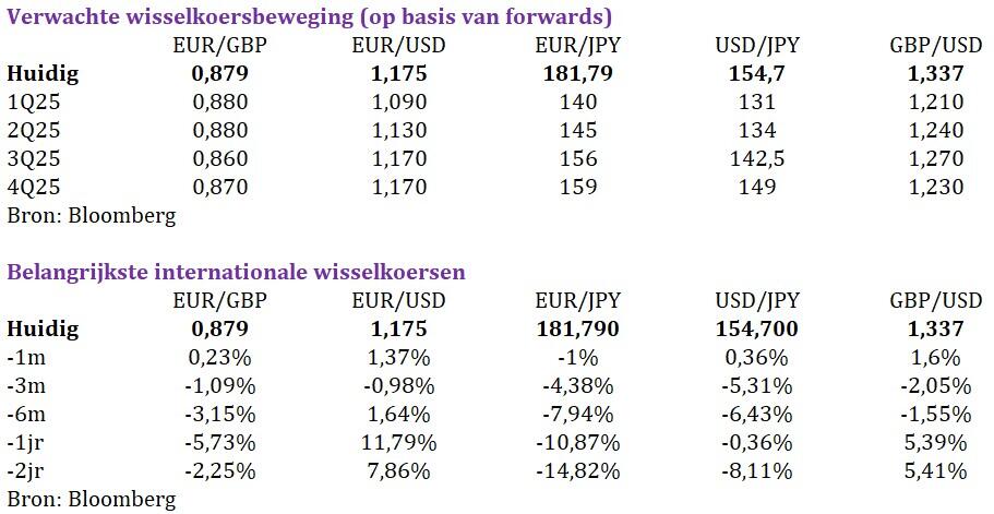 - Op de obligatiemarkt bleef het kalm. De 10-jaarsrente daalde met zo’n 1 à 2 basispunten, tot 4,16% in de VS en 2,85% in Duitsland, maar dat was onvoldoende om de dollar (€1 = $1,1751) een hart onder de riem steken. De Japanse yen steeg wél ($1 = JPY 154, 85) in afwachting van mogelijke renteverhoging door de Bank of Japan later deze week. De Bitcoin kende een offday met een verlies van 4,8% tot 86.037 dollar. De olieprijs blijft zijn neergang ondertussen ook doorzetten, met een verlies van 1,1% voor de Brent-variant tot 60,01 dollar per vat.
