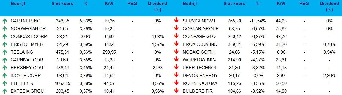 Immunome: {{308468763, IMMUNOME INC, IMNM}} het biotechbedrijf steeg na het bekendmaken van positieve resultaten uit een fase 3-studie voor varegacestat, een medicijn dat desmoïdtumoren moet behandelen. “Deze bevindingen tonen het potentieel van varegacestat om best-in-class resultaten te bieden in een handige, eenmaal daagse orale behandeling die patiënten kan helpen hun leven terug te krijgen,” aldus CEO Clay Siegall in een verklaring.