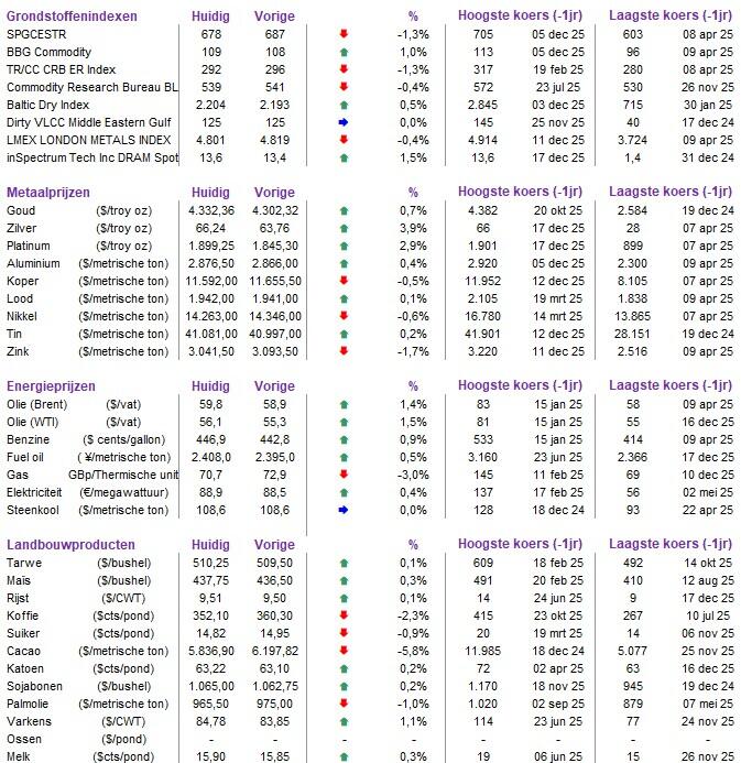 - Op de obligatiemarkt herstelden Amerikaanse Treasuries opnieuw, zodat de rentes over de hele curve met 3 tot 4 basispunten daalden. De dollarindex verloor daardoor 0,2%, terwijl goud 0,1% lager eindigde op 4.318 dollar per ounce in een opvallende volatiele handel en de Bitcoin daalde met 1,2% daalde tot 87.059 dollar, na een dieptepunt dat rond 85.500 dollar lag.