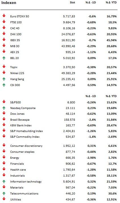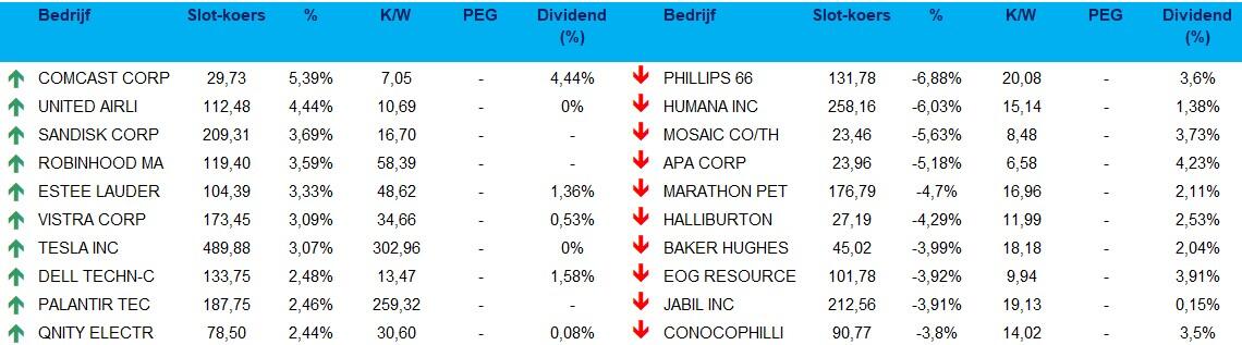 - Ook Wall Street ging lager, maar herstelden van de laagste dagniveaus. De S&P 500 verloor 0,24%, het derde opeenvolgende verlies op rij, terwijl de Nasdaq 0,23% aansterkte, dankzij techbedrijven zoals Tesla en Meta. Zowel groeiaandelen als waardeaandelen waren zwakker. Energie, farmacie en biotech (waaronder Pfizer), banken, verzekeraars, defensie en luchtvaart, transport, bouwmaterialen en Chinese technologie behoorden tot de achterblijvers. Daarentegen presteerden luchtvaartmaatschappijen, beurzen, cybersecurity, entertainment, discountwinkels, cosmetica en quantum computing beter.