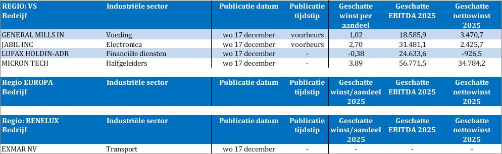 - Bedrijfsresultaten komen er vandaag van Exmar, General Mills, Jabil, Lufax Holding en Micron Technology.