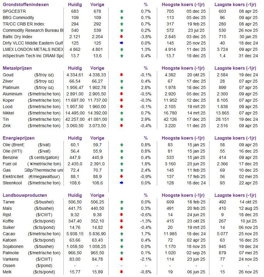 - Europese aandelenmarkten handelden gisteren vrijwel onveranderd, omdat verliezen bij technologiebedrijven gecompenseerd werden door sterke prestaties van grondstoffenwaarden. De Euro Stoxx hield de nul, weliswaar na een eerdere flirt met recordniveaus. Banken waren een steunpilaar, met een stijging van 1%, terwijl HSBC 2,7% won na een positieve analistenrating, maar ook de mijnbouwers waren in zwang (+1,1%) dankzij recordhoogtes voor zilver en hogere goudprijzen. Techspelers (-1,7%) stonden dan weer onder druk via chipmakers zoals ASML, BESI en ASMI, terwijl de bouwmaterialen en auto’s een winterprik moesten verteren. Maar goed, alles is relatief, want de Stoxx 600 steeg dit jaar bijna 15%, geholpen door dalende rentes, de hoop op een aangehouden Europese industrialisatie én diversificatie weg van dure Amerikaanse tech.