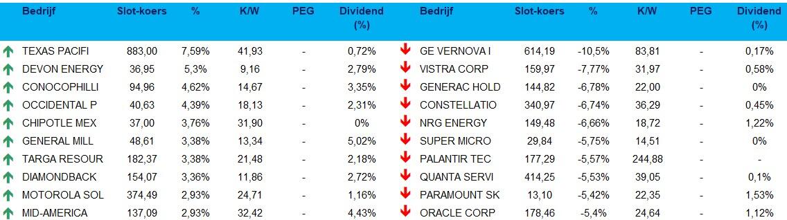 - Wel was er winst voor de energieaandelen omdat de olieprijs nog eens teken van leven vertoonde (ook al pieterde dat even snel weer uit dan het opgekomen was. Oliesjeik Trump beval immers een blokkade van alle gesanctioneerde olietankers van en naar Venezuela, wat ConocoPhillips en Occidental Petroleum beide meer dan 4% aan deed dikken.