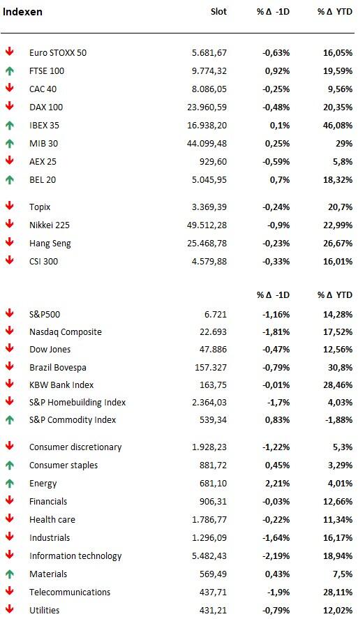 - Maar dan liep het mis. Op Wall Street torpedeerde Oracle (-4,5%) de herwonnen AI-sfeer, nadat Blue Owl Capital, de grootste datacenterpartner van het bedrijf, geen steun zal geven aan een deal van 10 miljard dollar voor een nieuwe faciliteit. Amazon verloor 0,6% omdat het 10 miljard dollar wil investeren in OpenAI, de maker van ChatGPT en Alphabet (-3,2%) kreeg geen open doekjes voor de samenwerking met Meta om Nvidia’s softwarevoordeel te ondermijnen. En dus daalde de S&P 500 1,2% en de technologiezware Nasdaq 1,8%, beide op het laagste niveau in drie weken. Omdat ook AI-leider Nvidia (-3,8%) en chipmaker Broadcom (-4,5%) de dans niet ontsnapten, kelderde de bredere Philadelphia Semiconductor chipindex 3,9%.