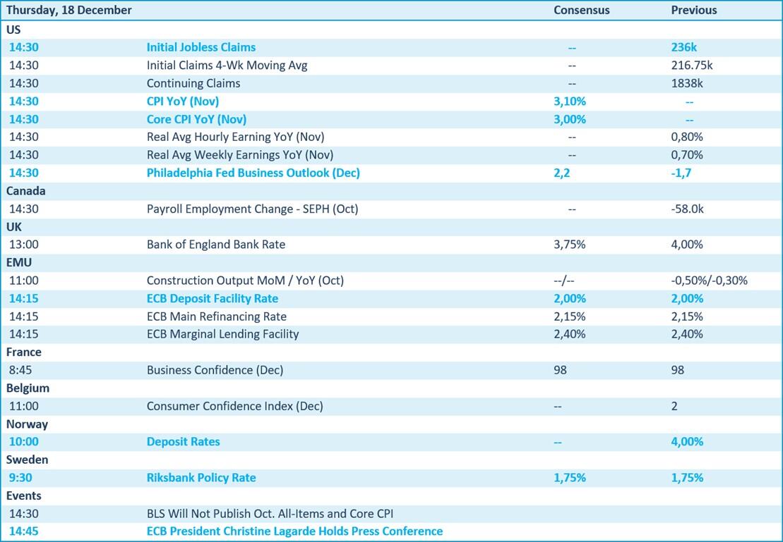 - Vandaag staat alles, of toch alvast héél veel, in het teken van de centrale banken. Want de ECB en de Bank of England buigen zich over de hoogte van de beleidsrentes en dus kijken we al naar het persbericht én de persconferenties. Ook Noorwegen en Zweden communiceren respectievelijk de “deposit tarieven” en de “Riksbank‑beleidsrente”.