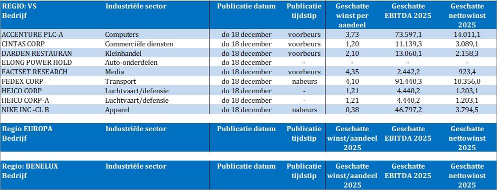 - Over naar de VS, waarin de wekelijkse nieuwe werkloosheidsaanvragen op de rol staan, maar véél belangrijk ook een update van de consumenteninflatie (inclusief de kerninflatie) en de evolutie van de reële lonen in november. Dat wordt afgekruid met de Philadelphia Fed‑enquête en een update van het Belgische consumentenvertrouwen over december.