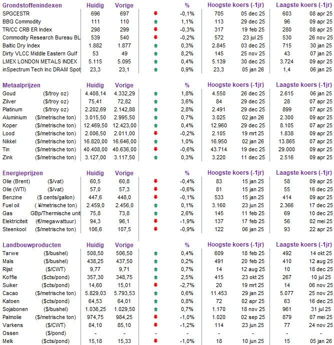 - De interventie van de VS in Venezuela in het weekend trekt veel media-aandacht, maar niet zozeer die van de markten. Geopolitieke gebeurtenissen hebben zelden een blijvende impact op de markten. De regering-Trump streeft uiteindelijk naar een regimewisseling met motieven die variëren van Maduro die wordt gezien als de onwettige (en nu voormalige) president tot Venezuela dat wordt gezien als een narcostaat die een impact heeft op de VS vanwege de kansen die worden gezien in de falende olie-industrie van het land. Maar de traditionele vluchthavens zoals goud (+2,1% tot 4.422 dollar per ounce) en de Amerikaanse dollar (€1 = $1,1686) doen het vanochtend wél goed. Ook Bitcoin ging goed van start met 2,7% winst tot 92.480 dollar.