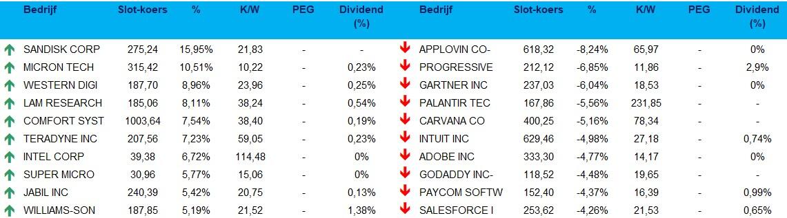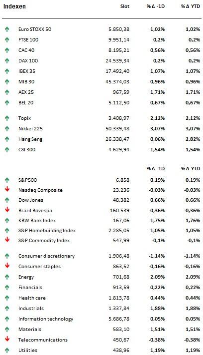 - De Aziatische beurzen vierden vannacht wel dik feest. De sterkste stijgers zijn Zuid-Korea (+3,15%), Taiwan (+2,49%) en Japan (+2,31%), maar ook buiten Noordoost-Azië ging het hard: China (+1,39%), Pakistan (+1,3%) en de Filipijnen (+1,22%) gingen vol voor winst, terwijl Zuidoost-Azië het iets bescheidener hield: Indonesië (+0,65%), Maleisië (+0,34%), Vietnam (+0,17%) en Sri Lanka (+0,59%).