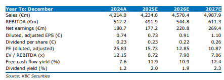 Het segment Industry kende een organische omzetdaling van 1,1%, maar presteerde daarmee beter dan de gemiddelde analistenverwachting (-4,3%) en de raming van KBC Securities (-7,0%). De aangepaste EBITA bedroeg 50 miljoen euro, wat boven de verwachtingen lag (46 miljoen euro gemiddeld en 45 miljoen euro voor KBC). De marges bleven stabiel op 17,7%, ondanks de lichte omzetdaling. Duitsland en Frankrijk blijven uitdagende markten, en de activiteiten in de auto-industrie en machinebouw – samen goed voor ongeveer 40% van de groepsomzet – blijven op een laag niveau.