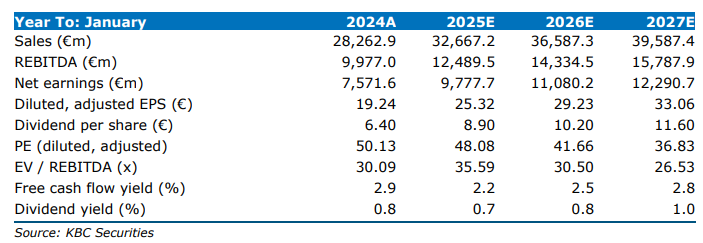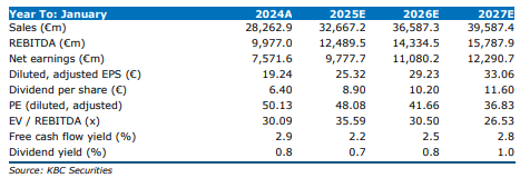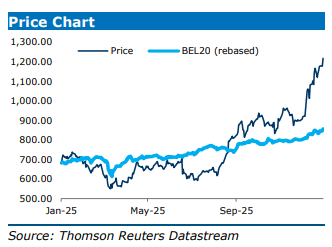 De KBC Securities-analist blijft onder de indruk van de uitzonderlijk sterke orderintake en het verbeterde investeringssentiment, gedreven door AI en veranderende geheugenmarktdynamiek. Op basis daarvan verhoogt hij zijn ramingen, waaronder een stijging van de winst-per-aandeel voor 2027 met 14% en een verhoging van het koers-winstmultipel naar 30x.