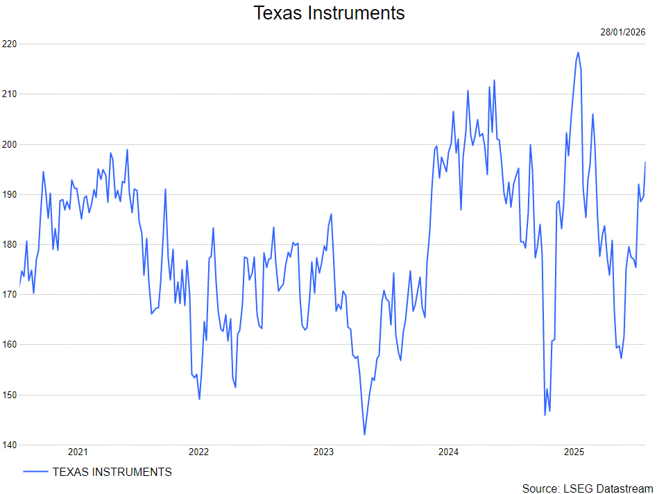 Texas Instruments rapporteerde over het vierde kwartaal van 2025 een omzet/nettowinst die grotendeels in lijn lagen met de consensus. De brutomarge kwam zo’n 110 basispunten boven de verwachting uit. De omzetgroei werd voornamelijk gedreven door het industriële segment (33% van de totale omzet) maar ook door een sterke groei in de datacenterdivisie (+70% jaar-op-jaar, goed voor 9% van de totale omzet). De omzetprognose voor het lopende kwartaal lag zo’n 2% boven de verwachting. De verwachte winst per aandeel van 1,35 dollar overtrof de gemiddelde analistenverwachtingen van 1,26 dollar.