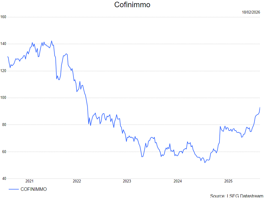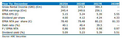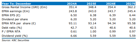 Cofinimmo publiceert op vrijdag zijn resultaten voor 2025. De groep gaf begin het jaar een minimale guidance van 6,2 euro recurrente EPRA‑EPS. Lynn verwacht dat Cofinimmo 2,9 procent boven deze guidance zal uitkomen. Op een volledig geconsolideerde fusiebasis raamt hij een gemiddelde jaarlijkse winstgroei van ongeveer 3,0 procent over de komende drie jaar, rekening houdend met het huidige investeringsprogramma en een gezondheidszorgrotatie van 300,0 miljoen euro.
