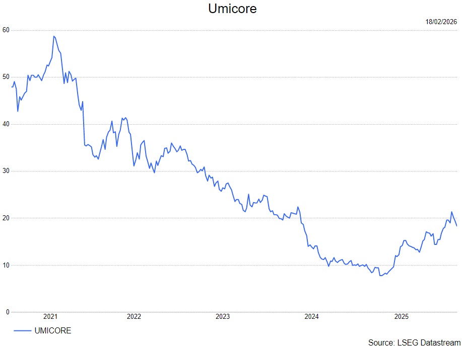 In de Belgische pers raakte bekend dat Umicore mogelijk geconfronteerd wordt met aanzienlijke kosten voor de aanpak van historisch radiumhoudend afval op zijn site in Olen, aldus KBC Securities‑analist Wim Hoste. De omvang van het probleem én de onduidelijkheid rond wie de kosten moet dragen — Umicore of de Belgische overheid — maken dit volgens hem een belangrijk aandachtspunt. Tegelijk verwacht hij dat Umicore op 20 februari resultaten voorlegt die licht boven de eigen EBITDA‑verwachtingen liggen, gesteund door uitzonderlijk sterke edelmetaalprijzen. .