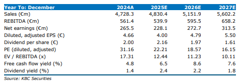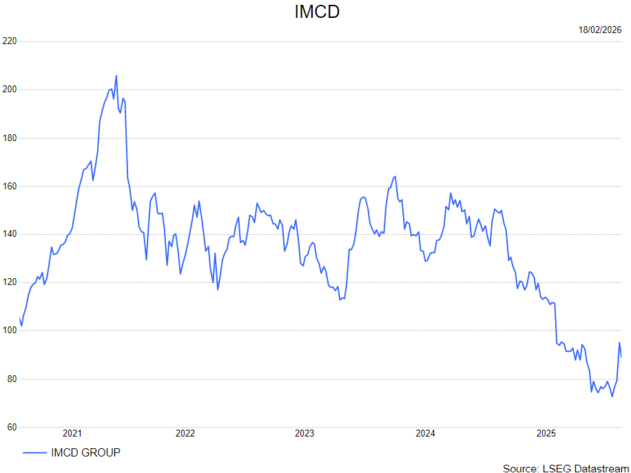 IMCD realiseerde in 2025 een omzet van 4,78 miljard euro, ongeveer 1 procent onder zowel de raming van KBC Securities als die van de gav. De organische groei bedroeg 0,5 procent, wat tussen de verwachting van KBC Securities (0,1 procent) en de gav (1,3 procent) lag. Valutabewegingen hadden een negatieve impact van 3,5 procent, maar deze werd ruimschoots gecompenseerd door acquisitiegroei van 4,1 procent jaar‑op‑jaar.
