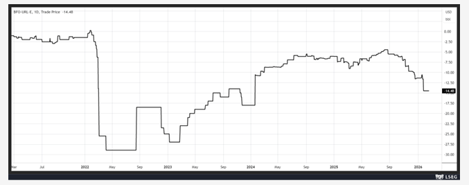 Meer specifiek vertraagde de jaarlijkse loonstijging in de privésector, exclusief bonussen en nauw gevolgd door de BoE, naar 3,4% in de drie maanden tot december, tegen 3,6% in de drie maanden tot november. Het rendement op de 2‑jarige Britse staatsobligatie daalde na deze cijfers, wat de stijgende waarschijnlijkheid van een renteverlaging in maart weerspiegelt.