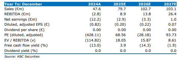 Door deze schrapping kwam de aangepaste EBITDA‑verwachting voor 2025 uit op –3,4 miljoen euro, terwijl in het model van de analist nog 8,9 miljoen euro stond ingeschat.