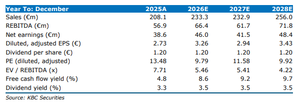Volgens de analist steeg de orderintake in 2025 met 7,8 procent jaar op jaar tot 225 miljoen euro, inclusief 14,8 miljoen euro voor Big Event Rental (BER). De omzet nam toe met 5,1 procent tot 208,1 miljoen euro, tegenover een eerdere schatting van KBC Securities van 198 miljoen euro. Wanneer de Big Event Rental‑bijdrage van 2024 niet wordt meegerekend, zou de groei 14,2 procent bedragen hebben.