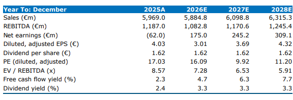 Ondanks het winstherstel bleef de operationele trend zwak. De omzet daalde met 5,6 procent tot 14,03 miljard euro, terwijl EBIT vóór bijzondere posten terugviel naar 76 miljoen euro, een daling van 84,1 procent jaar op jaar. De aangepaste EBITDA zakte naar 1,03 miljard euro (–28 procent) met een marge van 7,4 procent (tegenover 9,6 procent een jaar eerder). De aangepaste winst per aandeel kwam uit op –0,34 euro, tegenover +0,59 euro vorig jaar.