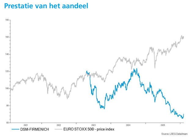 Op basis van de eigen aangepaste EBITDA-raming van KBC Securities voor 2026 van 345 miljoen euro – waarin Bovaer en Veramaris nog zijn inbegrepen – komt de impliciete multiple uit op ongeveer 6,4x. Wanneer wordt uitgegaan van de gemiddelde analistenverwachting (gav) voor de aangepaste EBITDA in 2026 van 309 miljoen euro, bedraagt de multiple ongeveer 7,1x.