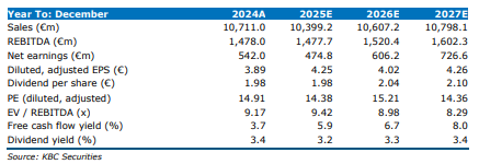 De bedrijfskasstroom (EBITA) bedroeg 191 miljoen euro (KBC Securities: 205 miljoen euro; gav: 182 miljoen euro), goed voor een marge van 3,3% (KBC Securities: 3,4%; gav: 3,1%), wat vergelijkbaar is met vorig jaar. De nettowinst daalde met 22% op jaarbasis tot 83 miljoen euro (KBC Securities: 103 miljoen euro).