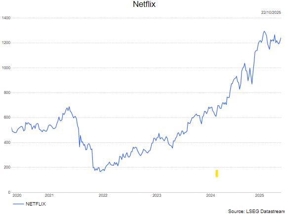 Netflix leverde opnieuw een solide kwartaalrapport af dat evenwel ontsierd werd door het belastinggeschil in Brazilië. Beleggers hadden evenwel meer verwacht gezien de sterke programmatie in het derde kwartaal. Vandaar de ontgoocheling en de koersdaling van circa 7% nabeurs.