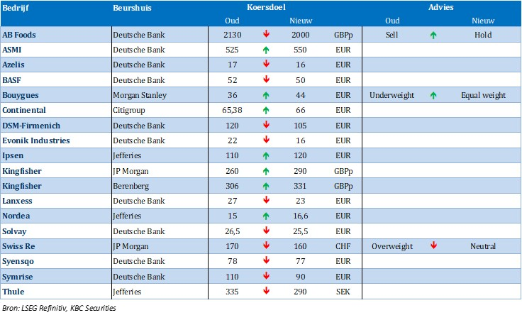 • KBC Securities verlaagt het koersdoel voor de Nederlandse dienstverlener in bodemonderzoek en geotechniek, die pas een derde winstwaarschuwing uitbracht. Het eerder voorspelde omzetherstel in de tweede helft van 2025 lijkt nu onrealistisch. Door uitgestelde en ingeperkte projecten wordt een omzetverlies van ongeveer 100 miljoen euro verwacht, terwijl het offshore windsegment en vooral de olie- en gasmarkt onder druk staan. Het bedrijf kondigde extra kostenbesparingen aan, waaronder een reductie van 300 voltijdse banen en een verlaging van de investeringen in 2026. Het koersdoel van KBC Securities gaat van 14 naar 11,5 euro en de aanbeveling is 'Houden'.