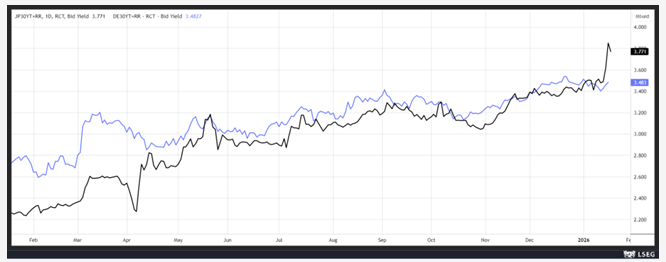 In het geval van Japan vrezen beleggers dat de verschillende politieke partijen zich zullen storten in een opbod van stimuleringsmaatregelen om de gunst van de kiezers te winnen — maatregelen die onvermijdelijk het begrotingstekort vergroten.Premier Sanae Takaichi, die al haar stimuleringsprogramma presenteert, doet niet onder en lanceerde haar campagne met de belofte om gedurende twee jaar een belasting op voedingsmiddelen op te schorten. Beleggers vrezen dat Japan een ineenstorting van zijn obligatiemarkt zal meemaken zoals die van de Britse staatsobligaties in 2022.Resultaat: het rendement op de Japanse 30-jaars obligatie ligt nu 35 basispunten hoger dan dat van Duitsland.