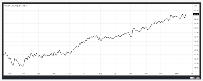 Op dat niveau aarzelen beleggers om te kopen — zowel binnenlandse beleggers als buitenlandse — ook omdat de yen sterk onder druk blijft (de grafiek toont zijn evolutie ten opzichte van de euro).