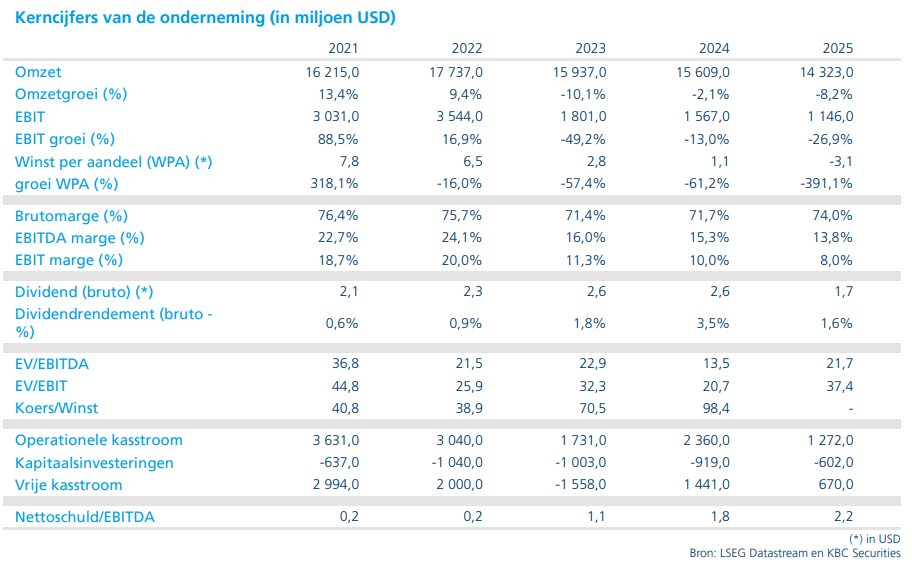 Gecorrigeerd voor negatieve valuta‑ en scope‑effecten* wordt de aangepaste EBITDA voor 2026 geraamd op minstens 1470 miljoen euro. Dat cijfer lag 2 procent onder de verwachting van KBC Securities en 4 procent onder de gemiddelde analistenverwachting vóór de publicatie van de kwartaalcijfers, en komt neer op een jaar‑op‑jaar groei van minstens 2 procent tegenover de gerealiseerde cijfers van 2025.