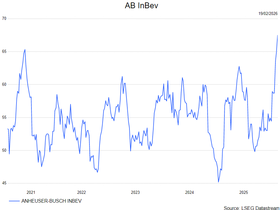 De financiële positie van AB InBev is de voorbije jaren structureel verbeterd, met een nettoschuld/EBITDA‑ratio van 2,9x. Het bedrijf verhoogde recent het dividend tot 1,15 euro en startte in het vierde kwartaal van 2025 een aandeleninkoopprogramma ter waarde van 6 miljard dollar, dat over twee jaar zal worden uitgevoerd.
