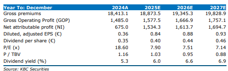 Volgens de analist boekte Aegon in de tweede jaarhelft van 2025 een operationeel resultaat van 858 miljoen euro, ruim boven de ramingen van KBC Securities (815 miljoen euro) en de gemiddelde analistenverwachtingen (831 miljoen euro). Dit betekent een groei van 11% jaar op jaar, gedragen door sterke commerciële momentum in alle bedrijfseenheden en gunstige financiële marktomstandigheden.