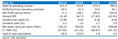 Tegelijk blijft KBC Securities voorzichtig. De beperkte transparantie, de complexe structuur en fiscale onzekerheden blijven aandachtspunten. Met de huidige waardering en een beperkte korting ten opzichte van de NAV is het opwaarts potentieel kleiner geworden. Daarom blijft de aanbeveling "Opbouwen", in afwachting van nieuwe impulsen uit de jaarresultaten.