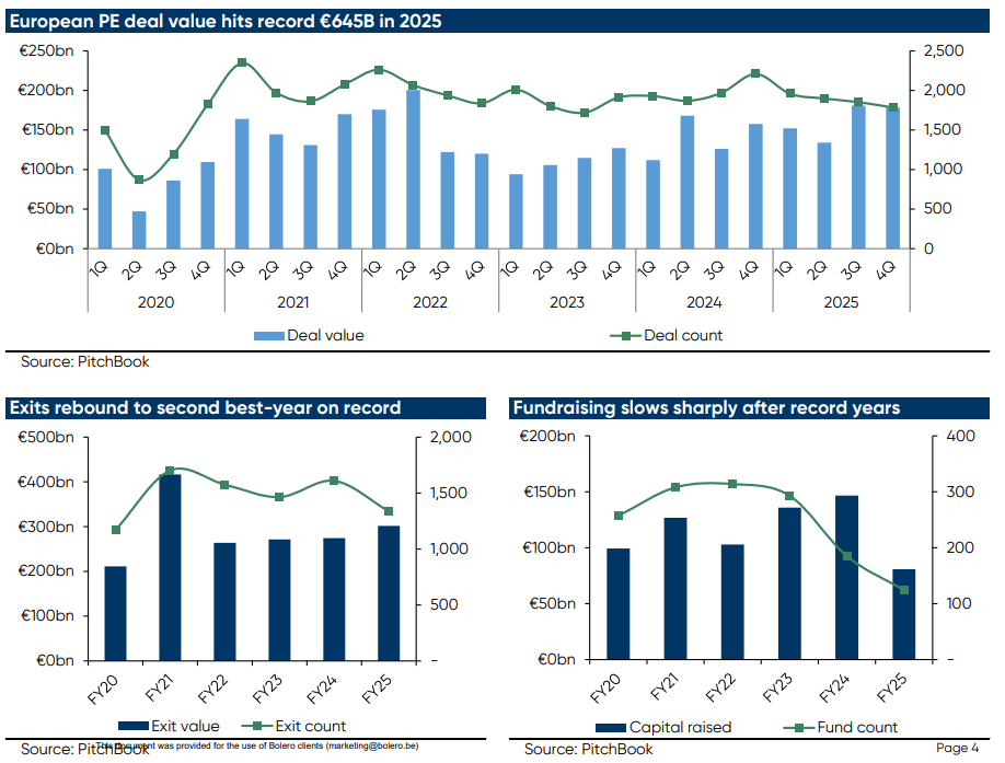 2025 was een uitzonderlijk sterk jaar voor Europese private equity. De totale dealwaarde steeg met 14,4% tot 645 miljard euro, het hoogste niveau ooit, terwijl ook het aantal transacties toenam. Vier renteverlagingen door de ECB en de Bank of England verlaagden de financieringskosten en zorgden voor een heropleving van leveraged buy-outs (overname die grotendeels met geleend geld wordt gefinancierd) en megadeals, die bijna een derde van de totale dealwaarde vertegenwoordigden.